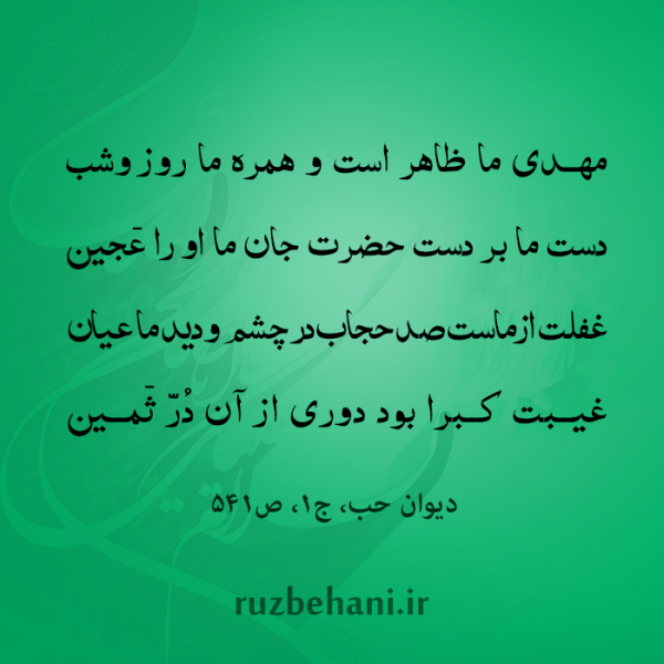 مهـدی ما ظاهر است و همره ما روز وشب دست ما بر دست حضرت جان ما او را عَجین غفلت از ماست صد حجاب در چشم و دید ما عیان غیـبت کـبرا بود دوری از آن دُرّ ثَمـین