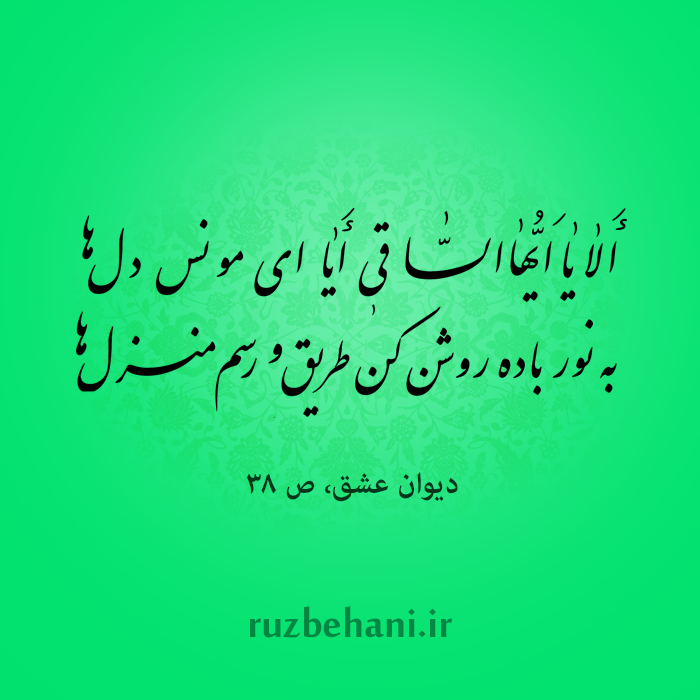 الا یا ایها الساقی ایا ای مونس دلها به نور باده روشن کن طریق و رسم منزل ها دیوان عشق، ص ۳۸